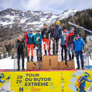 La più tecnica delle gare scialpinistiche italiane ha confermato la propria fama proponendo nella giornata d’esordio un “garone” da 24km (2.438m up e 2220 di tecnicissima discesa) con passaggio ai 3.486 mslm della Testa del Rutor. A rendere ancora più epica questa traversata in quota, attraverso il ghiacciaio del Rutor, un forte vento e delle temperature a dir poco rigide.
